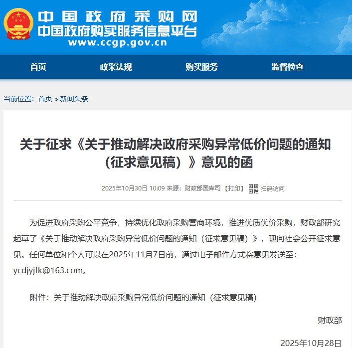 財(cái)政部就《關(guān)于推動(dòng)解決政府采購異常低價(jià)問題的通知(征求意見稿)》向社會公開征求意見